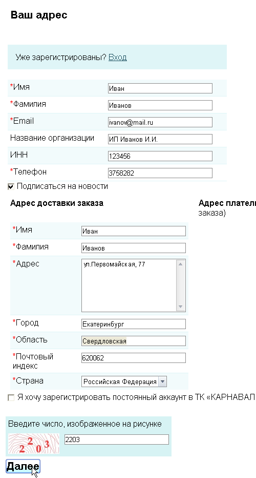 5. После нажатия на кнопку "Оформить заказ" Вам предлагается войти как зарегистрированному пользователю (пройти авторизацию) или пройти процедуру регистрации заполнив поля.